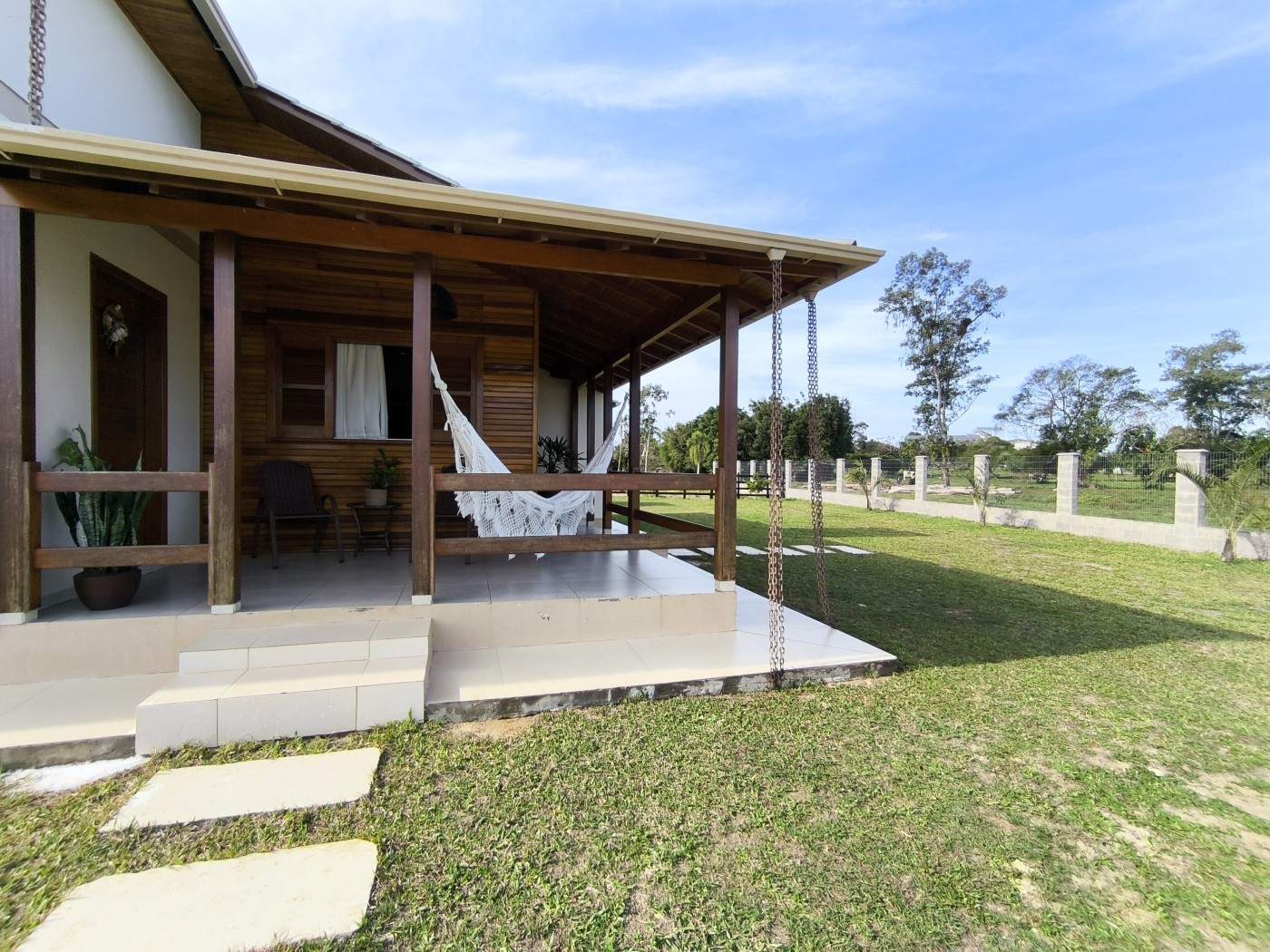 Com 2 quartos, 01 suíte e 1 banheiro, a casa principal se destaca pela sua área de lazer completa com churrasqueira e um amplo jardim gramado, perfeito para momentos de descontração. A cozinha possui armários embutidos e todo o imóvel é feito com materiais de alta qualidade como cerâmica, madeira e terra, que conferem um toque rústico e acolhedor.